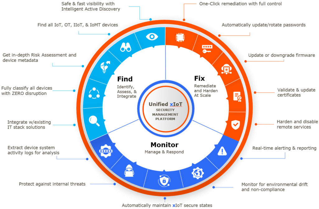 - „Intelligent Active Discovery” umożliwia bezagentowe i bezinwazyjne wykrywanie oraz rozpoznawanie urządzeń. Działa przez komunikację z urządzeniami przy wykorzystaniu ich natywnych protokołów, co pozwala bez zakłóceń pracy systemów produkcyjnych wykrywać sprzęt w całym obszarze xIoT (IoT, OT, IoMT, itp.).